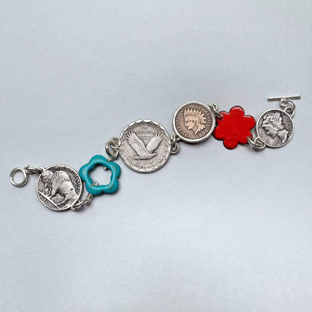 Full of American symbolism, this bracelet features all genuine coins. The buffalo nickel is a symbol of strength in the American West. The liberty dime features lady liberty wearing a winged cap, & the standing liberty quarter features an American eagle in flight, both representing freedom. The indian cent depicts the growth of our nation.