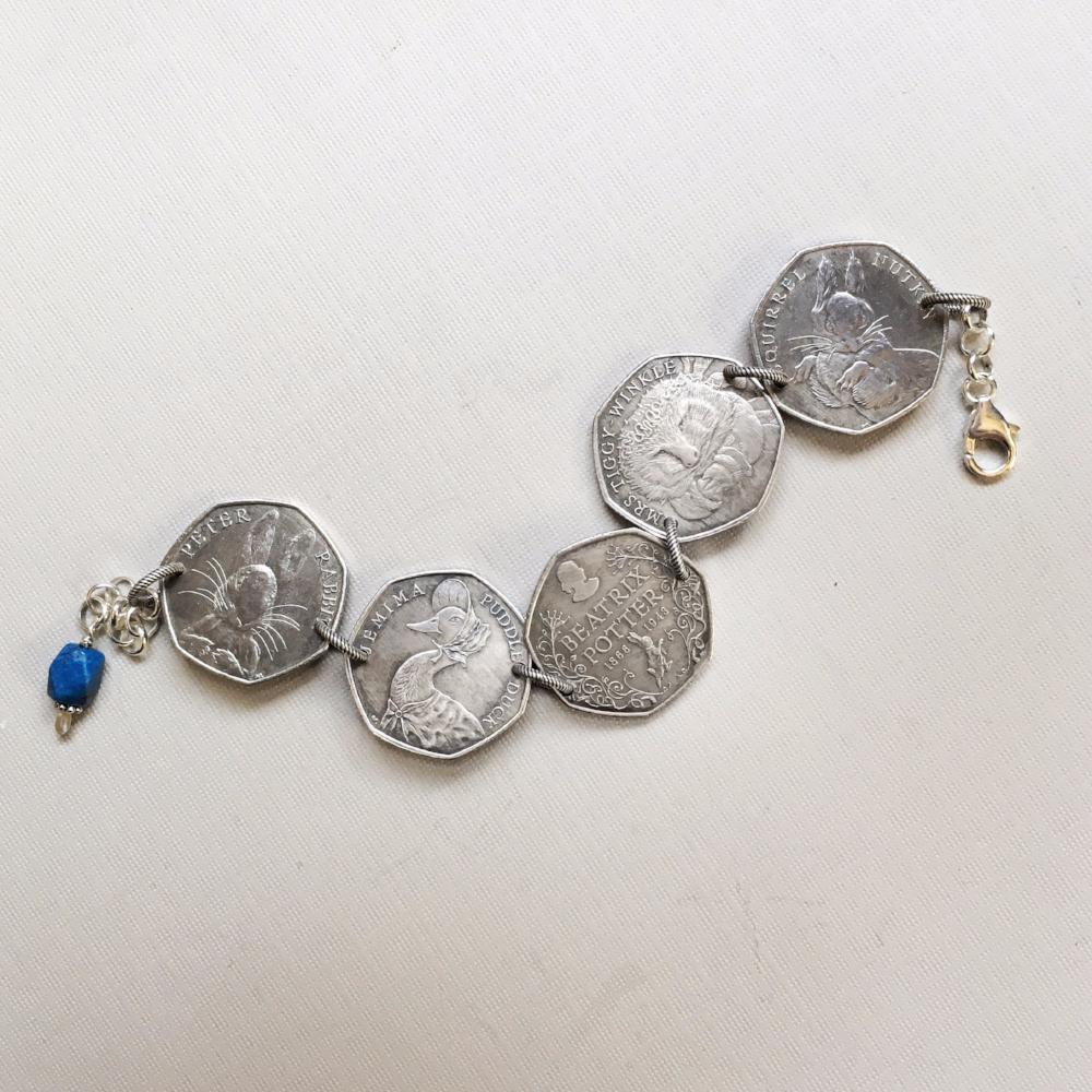 Bracelet made from all five genuine coins, sterling silver chain and clasp and a lapis accent stone. Bracelet length is adjustable with 8.25" being the largest.
