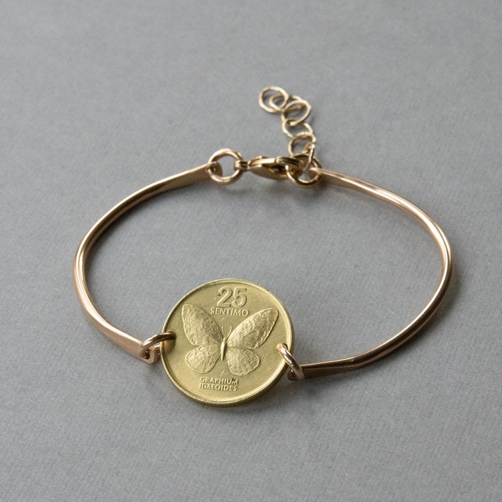 Genuine Philippines coin, gold-fill wire cuff bracelet with a lobster claw closure. Adjustable size.