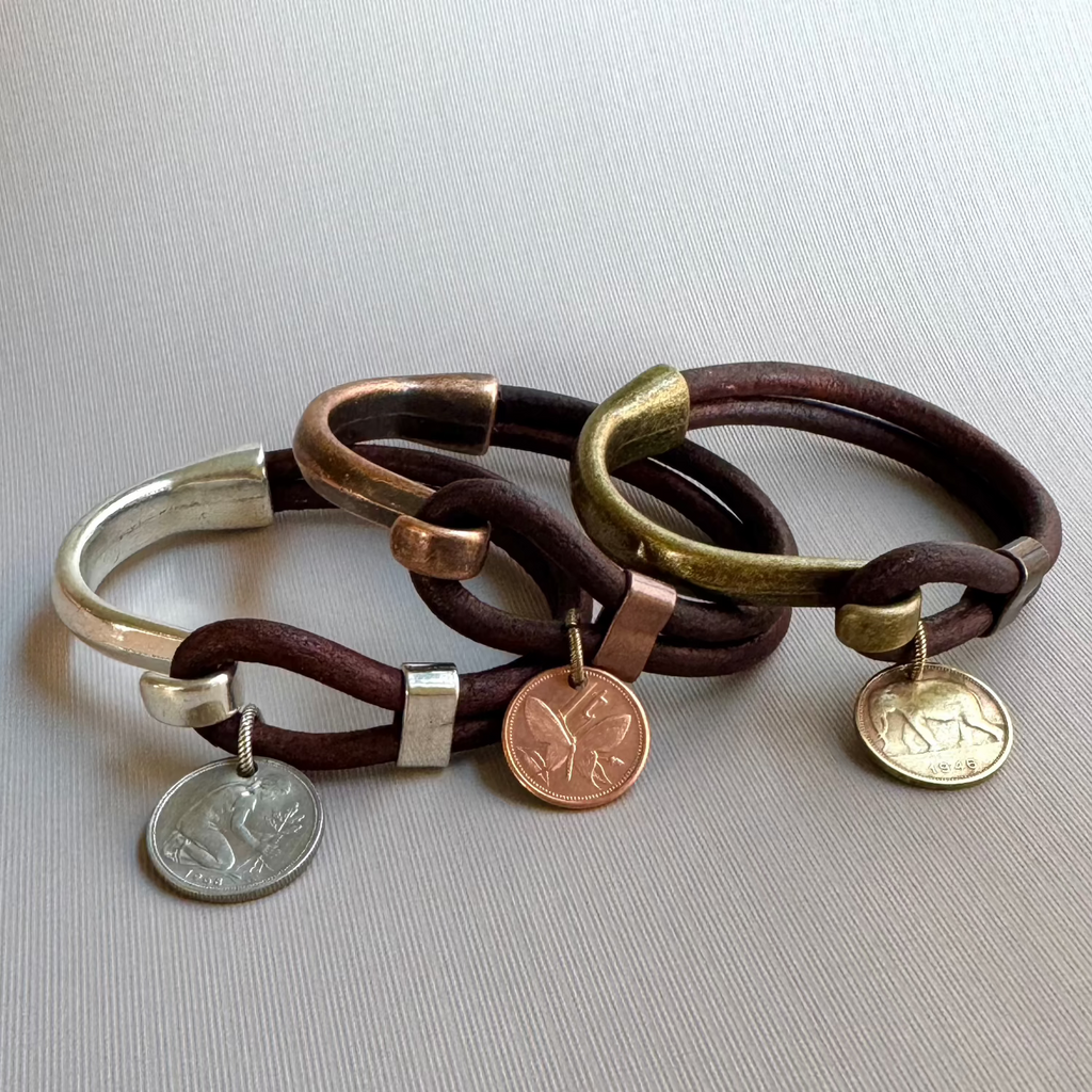 This cuff is your next favorite piece of jewelry. It is a half leather/half metal cuff bracelet adorned with a genuine coin. Leather comes in two colors, metal comes in three colors.