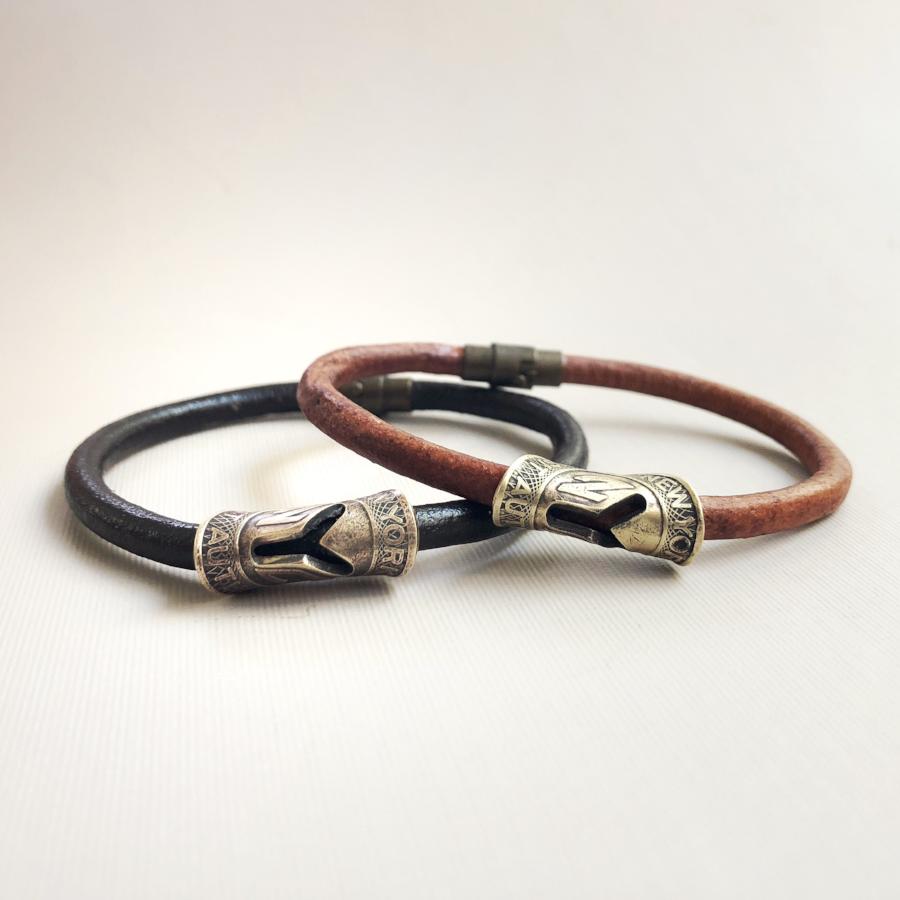 A vintage New York City subway token has been heated and forged into a bead and attached to a simple, sleek leather cord bracelet. This large 'Y' cutout style was used from 1970 to 1980. The pentagonal token was used from 1995 to 2003. The five sides of the shape represent each of the five boroughs of New York.