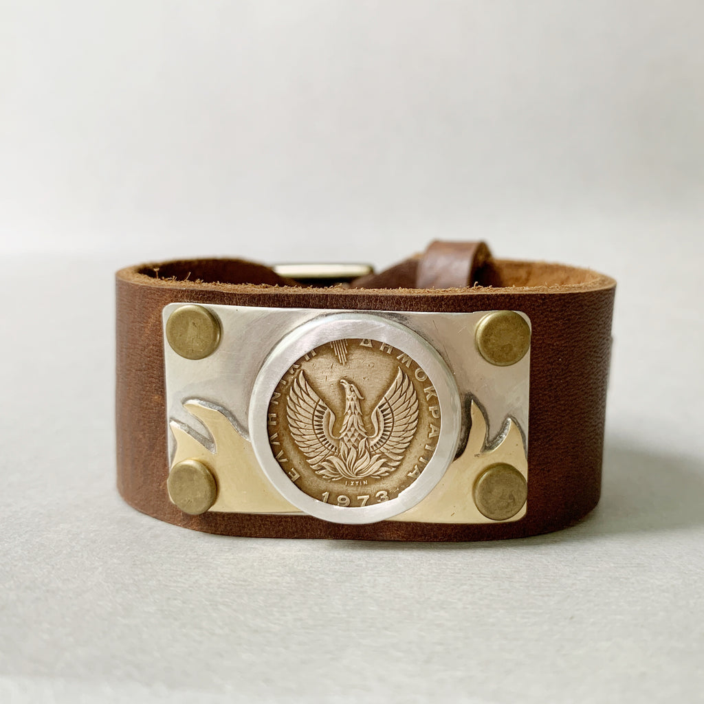 Rustic brown leather, sterling silver, brass and antiqued brass rivets, a genuine Greek coin, adjustable size with a buckle closure.