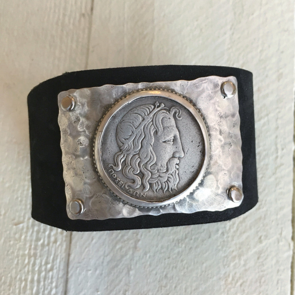 90% silver Greek coin, sterling silver hand-made mounting plate, genuine matte leather belt-style cuff with buckle, 1-3.4" wide, length is adjustable.