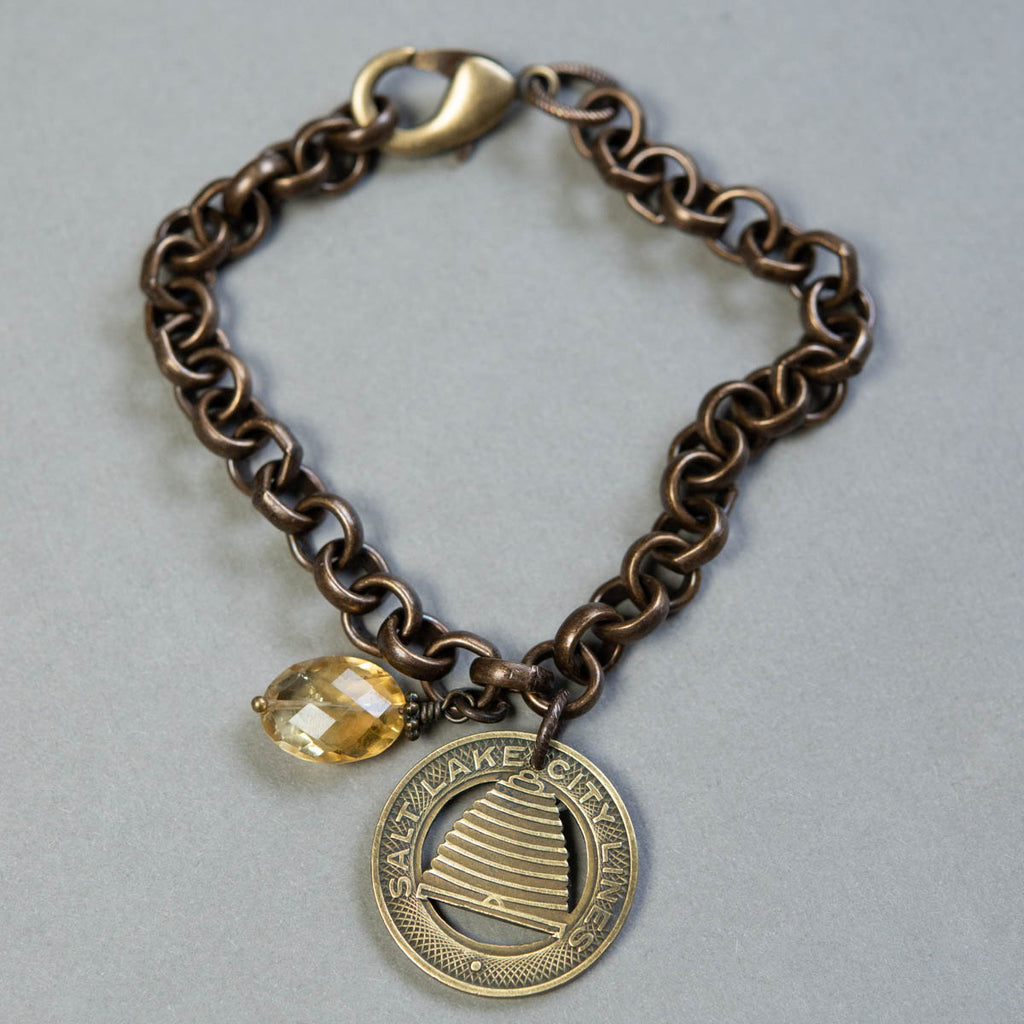 This bracelet is 8" long (adjustable to smaller) antiqued brass chain. It features a genuine, vintage trolley car token with the beehive (Utah is the beehive state!) cutout design along with a gorgeous honey-colored citrine gem.
