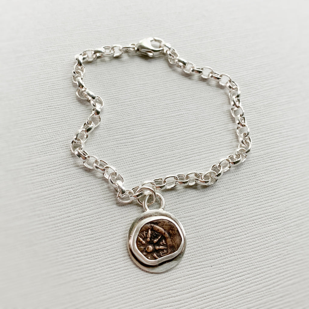These little bronze coins are authentic coins found in the ancient kingdoms of Judah and Israel. I set them in sterling silver bezel settings that are individually made for the irregular shape of each coin.